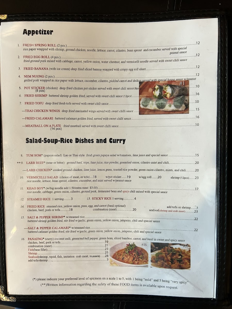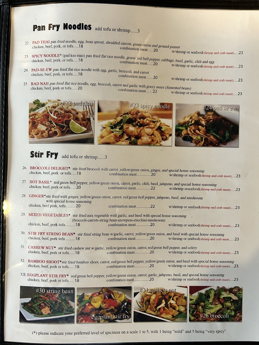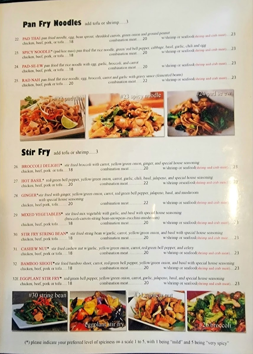 Noodle and Stir-Fry Dishes: Popular options include Pan Fry Noodle dishes such as Pad Thai, Spicy Noodle, Pad Se Ew, and Rad Nah. These selections highlight classic Thai noodle preparations with various proteins and sauces.