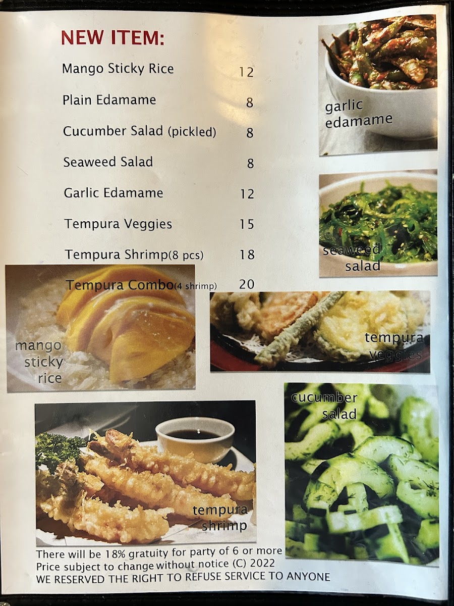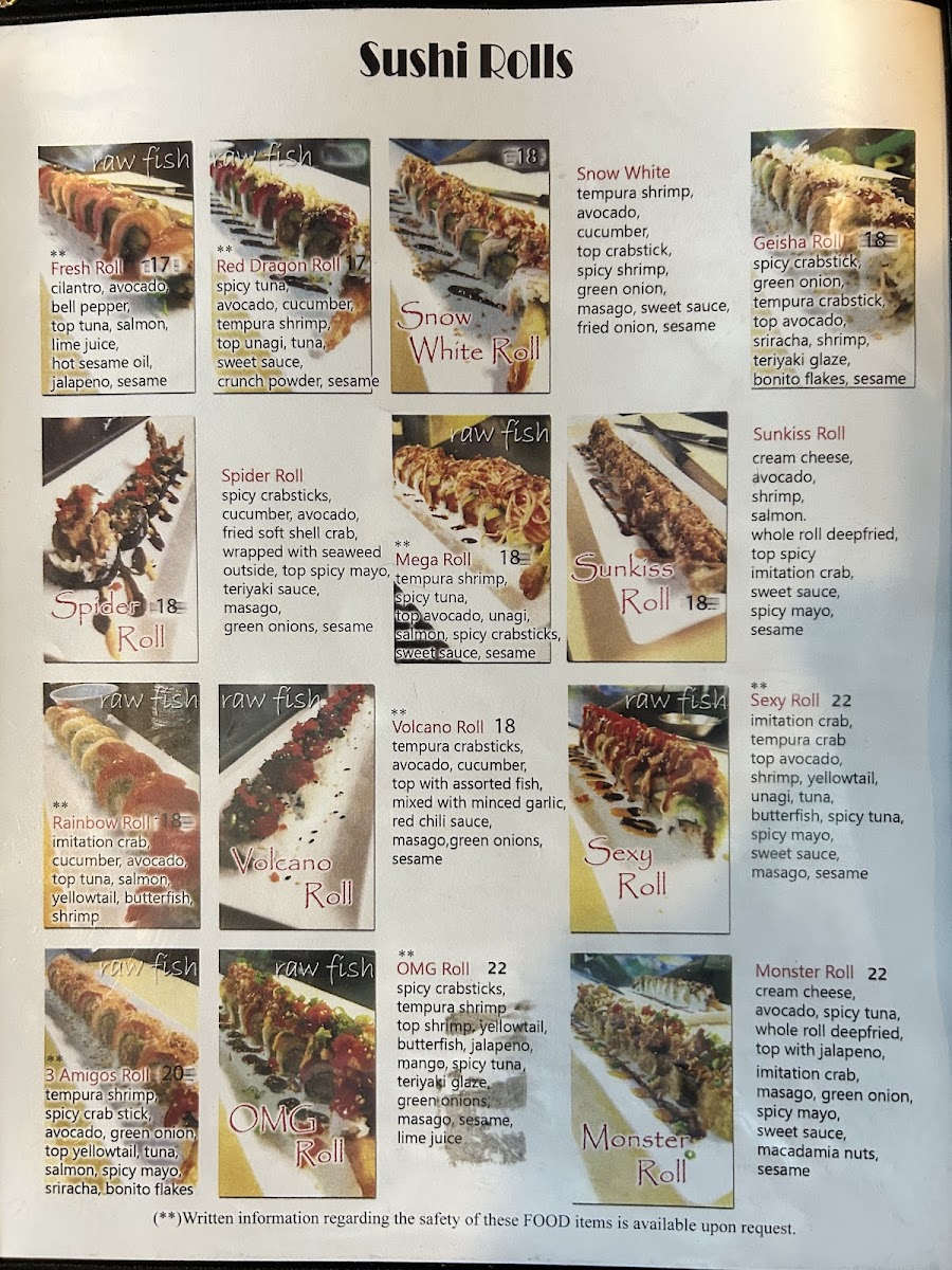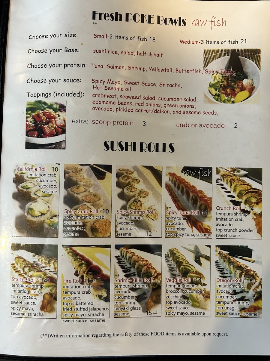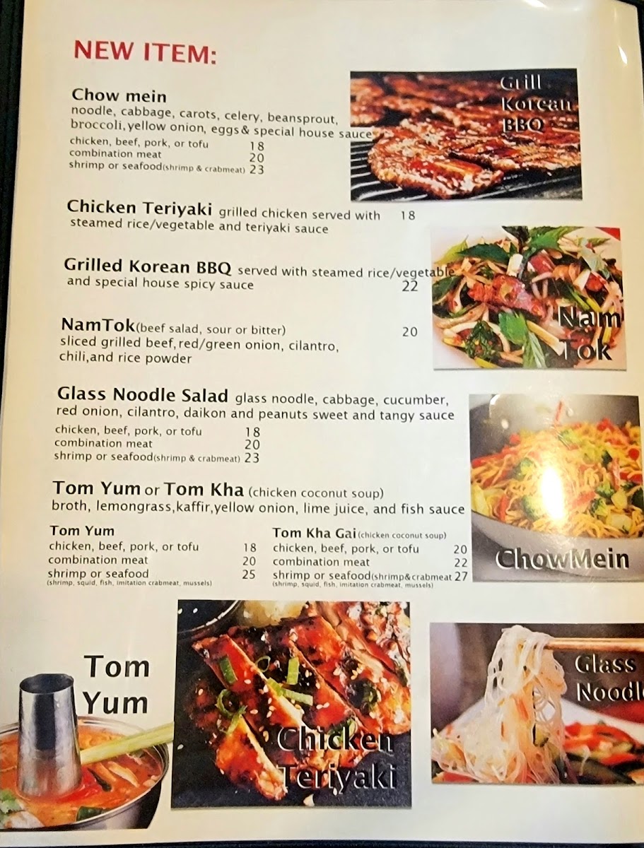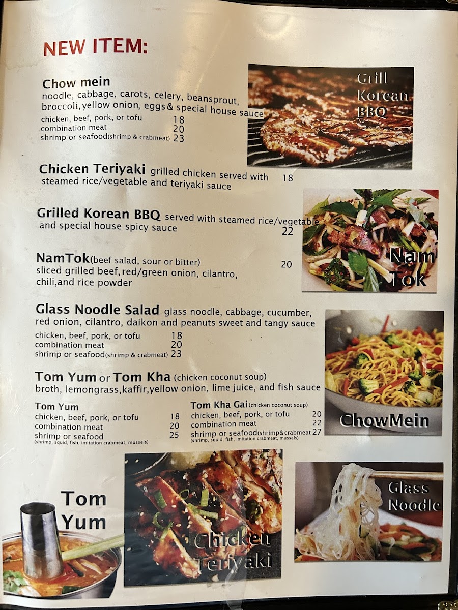 Other menu highlights include staple items such as Chicken Pho, Fresh Rolls, Grilled Korean BBQ Short Ribs with Sticky Rice, Poke Bowls with shrimp and salmon, Sushi rolls including Dragon Roll and Volcano Roll, and soups like Tom Yum Noodle Soup.