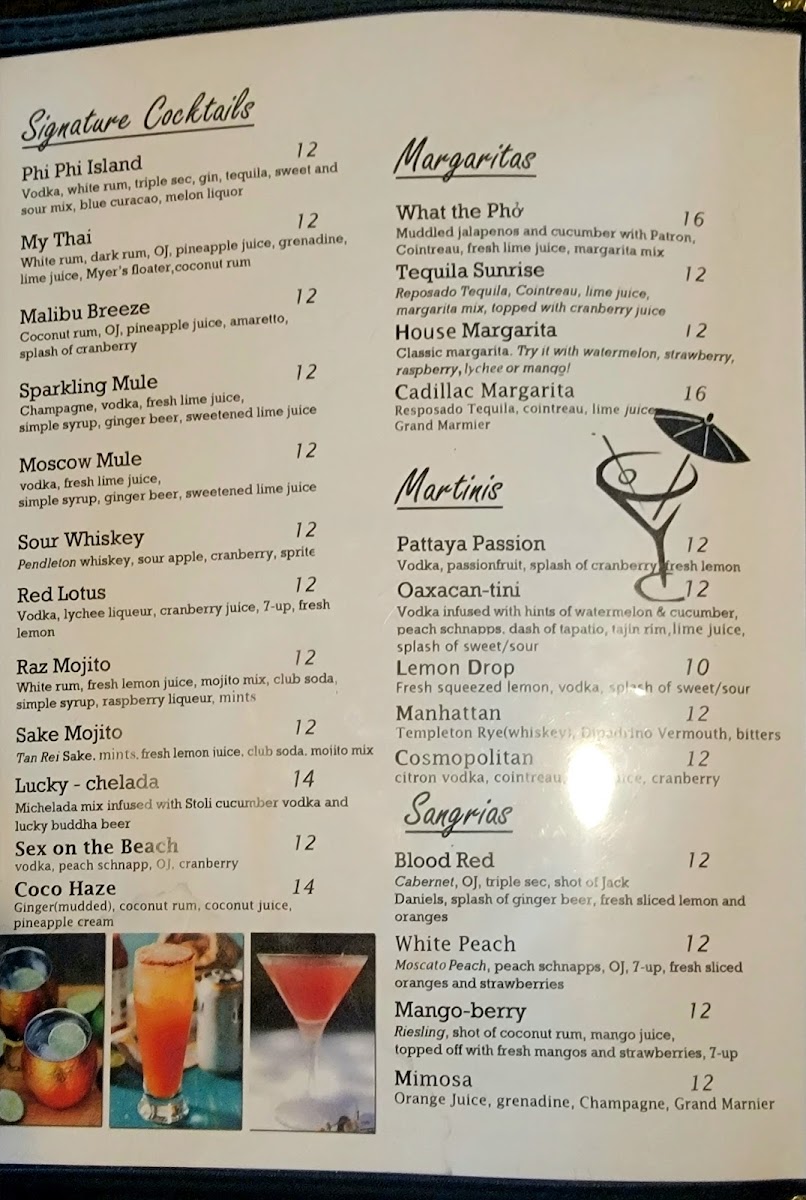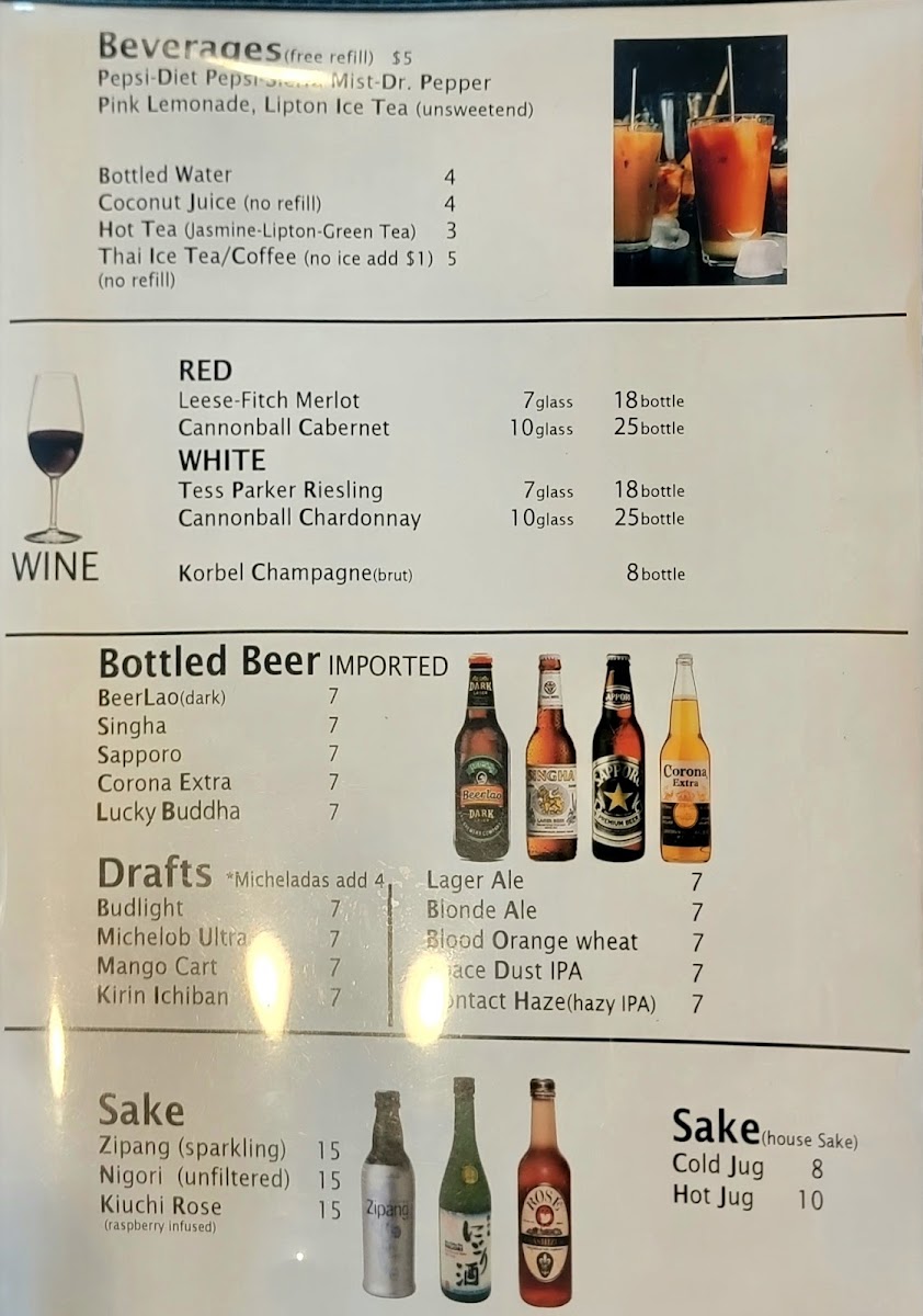 Beverages: Guests can choose from a variety of bottled beers including Beerlao, Singha, Sapporo, Corona Extra, and Lucky Buddha, as well as non-alcoholic options like traditional Thai Tea and specialty drinks such as Michelada and Lucky Chelada.
